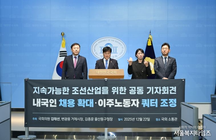 서울복지타임즈 이재연 기자 | 변광용 거제시장은 지난 22일 김태선 국회의원(울산동구, 환경노동위), 김종훈 울산 동구청장과 함께 국회 소통관에서 기자회견을 열고, ‘조선산업기본법’ 제정, 내국인 채용 확대, 외국인 쿼터 축소를 골자로 한 고용구조 전환의 필요성을 정부에 촉구했다.