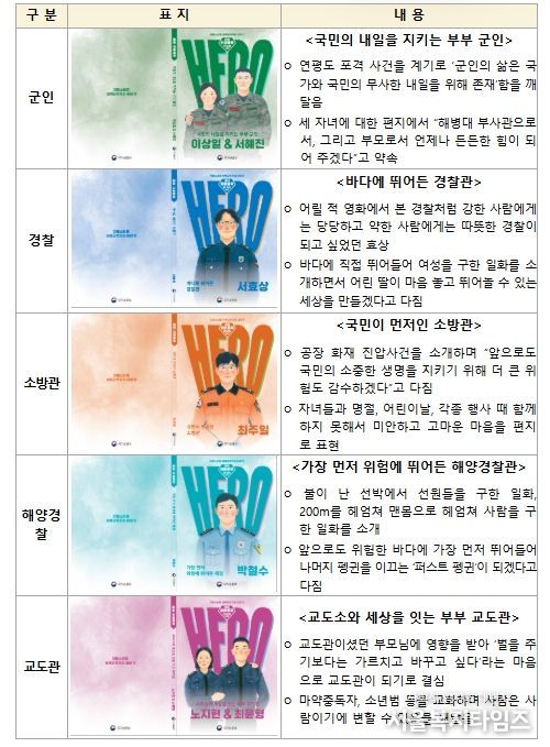 '마이 히어로북'은 △군인 △경찰 △소방관 △해양경찰 △교도관 등 국가와 지역사회를 위해 일하는 제복근무자의 실제 사례를 동화 형식으로 소개한 도서이다. 어린이 눈높이에 맞춰 제작되어, 제복근무자의 역할과 노고를 쉽고 친근하게 이해할 수 있는것이 특징이다.