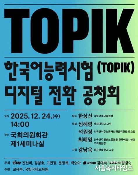 서울복지타임즈 이재연 기자 | 교육부, 국립국제교육원(원장 한상신)은 12월 24일 오후 2시, 국회의원회관 제1세미나실에서 여·야 의원실 공동주최로 ‘한국어능력시험(TOPIK) 디지털 전환 공청회’를 개최하고, ‘한국어능력시험 디지털 전환 기본 계획 수정 시안’에 대한 의견을 청취한다고 밝혔다.