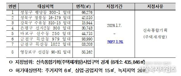 서울복지타임즈 이재연 기자 | 서울시는 신속통합기획 주택재개발 후보지로 선정된 8개 구역(총0.44㎢)을 신규 토지거래허가구역으로 지정하여 투기성 토지거래를 원천 차단하고 정비사업의 투명성을 강화한다.