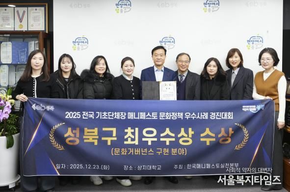 서울복지타임즈 이재연 기자 | 서울 성북구가 한국매니페스토실천본부와 강원특별자치도경제진흥원이 공동 주최한'제1회 2025 전국 기초단체장 매니페스토 문화정책 콘체르토(Concerto)'에서 문화거버넌스 분야 최우수상을 수상했다.