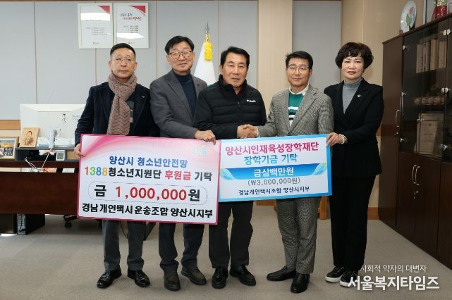 서울복지타임즈 이재연 기자 | 경남개인택시조합 양산시지부(지부장 장태영)은 26일 양산시를 방문해 인재육성장학재단(이사장 이희종)에 장학금 300만원과 1388청소년지원단에 후원금 100만원을 기탁했다.