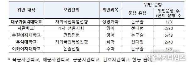 대구가톨릭대학교는 생명과학 1문항, 사관학교는 영어 2문항, 수원여자대학교는 영어 5문항, 우석대학교는 화학 2문항, 이화여자대학교는 수학 1문항이 고등학교 교육과정 범위를 위반한 것으로 나타났다. 위반 문항 비율은 대학별고사를 시행한 전체 대학의 문항 중 0.3%였다.