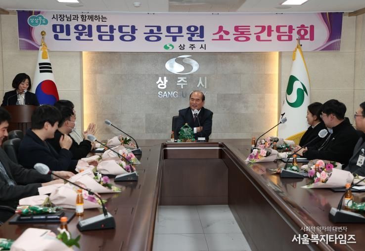 서울복지타임즈 이재연 기자 | 상주시는 12월 24일 시청 소회의실에서 민원담당 공무원과의 소통 간담회를 개최했다. 이번 간담회는 연말 민원처리 마일리지 및 국민신문고 민원 처리 우수 공무원으로 선정된 직원 18명의 시상식이 함께 진행됐다.