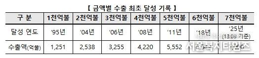 수출 7,000억 달러는 ‘18년도 6,000억 달러 달성 이후 7년만에 이뤄낸 쾌거로 전(全) 세계에서 6번째로 달성하며 수출강국 위상을 재확인했다. 특히, 6천억불은 7번째로 달성했으나, 7천억불은 6번째로 달성하며 우리 수출이 글로벌 주요국 대비 빠르게 성장하고 있음을 증명했다.