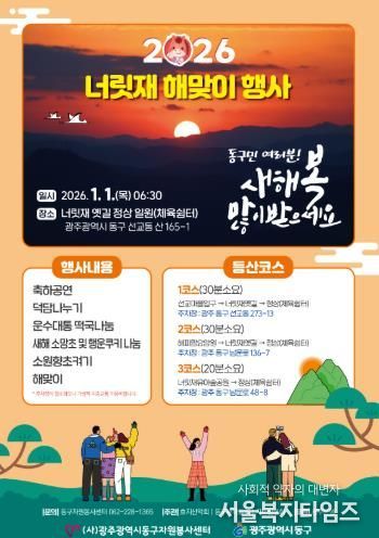 서울복지타임즈 이재연 기자 | 광주 동구는 2026년 병오년 새해를 맞아 1월1일 오전 7시 너릿재 옛길 정상(체육쉼터)에서 해맞이 행사와 함께 방문객에게 떡국을 나누는 ‘2026년 병오년 해맞이 떡국나눔 행사’를 개최한다고 밝혔다.