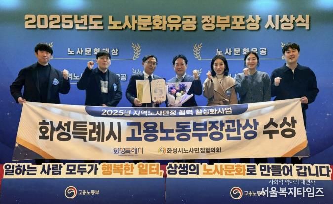 서울복지타임즈 이재연 기자 | 화성특례시는 지난 30일 고용노동부 주관으로 열린 '2025년 노사문화유공 정부포상 시상식’에서 ‘지역노사민정 협력 유공’단체부문 고용노동부장관 표창을 수상했다고 31일 밝혔다.
