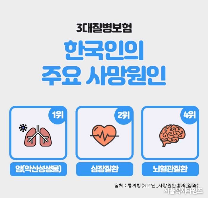 서울복지타임즈 이재연 기자 | 3대질병으로 일컬어지는 암, 뇌혈관질환, 심혈관질환은 한국인의 주요 사망원인에서 상위를 차지하고 있으며, 이에 대한 진단비를 집중적으로 보장해 주는 보험상품을 3대질병진단비 보험이라 할 수 있다.