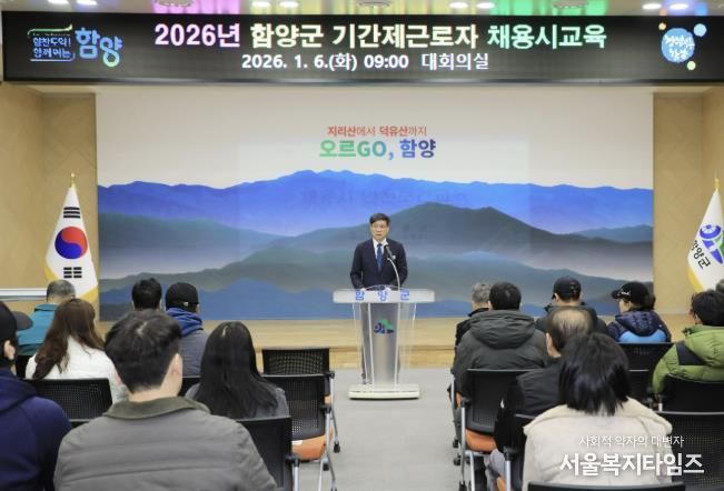 서울복지타임즈 이재연 기자 | 함양군은 1월 6일 군청 대회의실에서 신규 채용된 기간제 근로자 110명을 대상으로 '산업안전보건법'에 따른 산업안전·보건 교육을 진행했다.