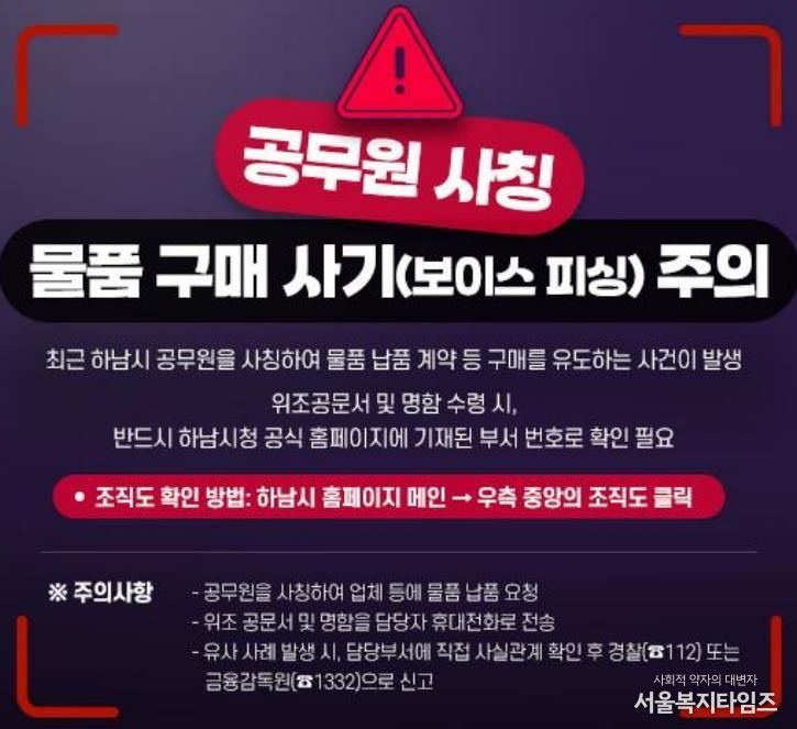 서울복지타임즈 이재연 기자 | 하남시는 최근 공무원을 사칭하여 관내 중소기업과 소상공인, 시민들을 대상으로 한 범죄 사례가 지속적으로 발생함에 따라 각별한 주의가 필요하다고 밝혔다.
