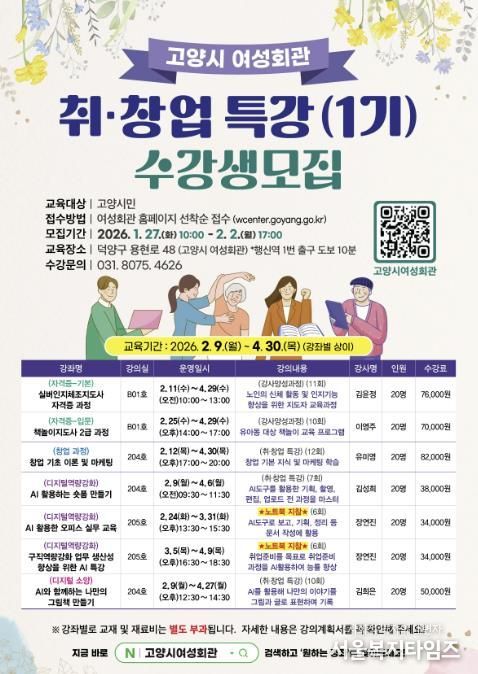 서울복지타임즈 이재연 기자 | 고양특례시 여성회관은 오는 27일부터 2026년 취창업 특강(1기) 수강생을 모집한다고 밝혔다.