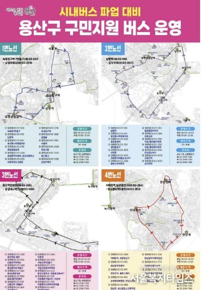 용산구 관계자는 “시내버스 파업으로 교통 혼잡과 이동 불편이 발생하고 있는 만큼, 마을버스와 지하철 이용, 승용차 함께 타기 등 교통 수요 분산에 구민 여러분의 적극적인 협조를 부탁드린다”라고 말했다.