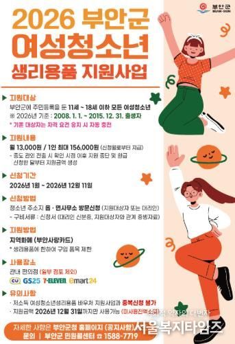 지원대상은 소득수준과 관계없이 부안군에 주소를 둔 11세부터 18세까지의 여성청소년으로, 2026년 기준 2008년 1월 1일~2015년 12월 31일 사이 출생자이다.