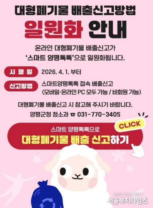 서울복지타임즈 이재연 기자 | 양평군은 오는 4월 1일부터 주민 편의 증진과 행정 효율성 강화를 위해 온라인 대형폐기물 배출신고 시스템을 모바일 행정 플랫폼 ‘스마트 양평톡톡’으로 통합 운영한다고 밝혔다.