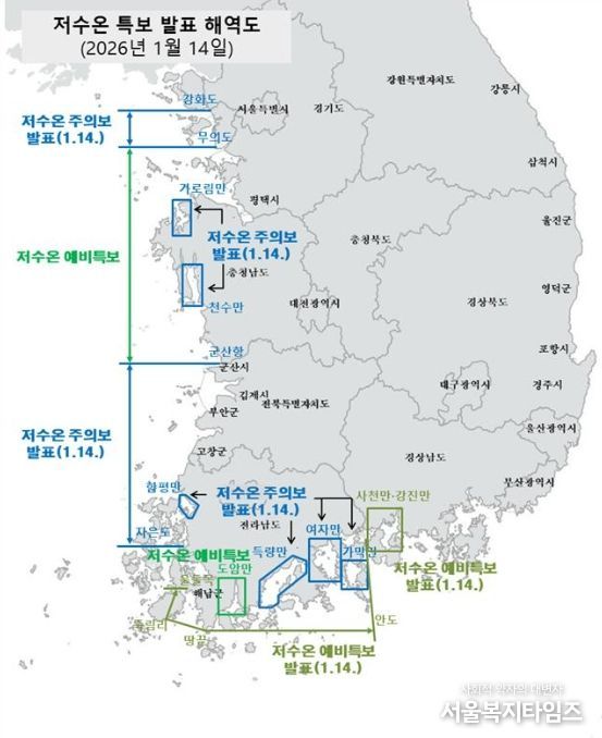 서울복지타임즈 이재연 기자 | 해양수산부는 1월 14일 12시부로 저수온 위기경보 ‘경계’ 단계를 발령했다고 밝혔다.
