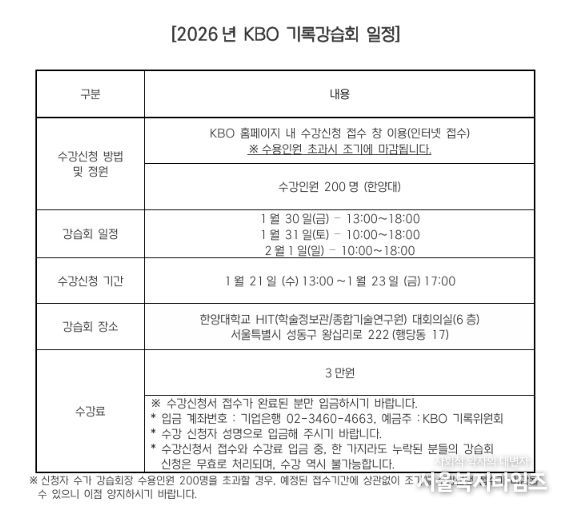 서울복지타임즈 이재연 기자 | 2026년 KBO 기록강습회가 1월 30일(금)부터 2월 1일(일)까지 서울 한양대학교에서 개최된다. 기록강습회는 야구 공식기록법의 보급과 이해를 통한 저변 확대를 목적으로 프로야구 원년인 1982년부터 개최됐다.