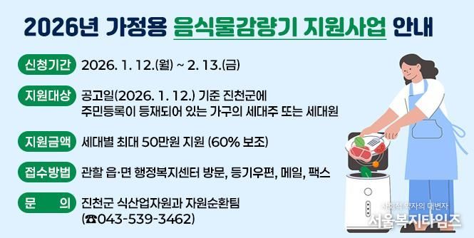 서울복지타임즈 이재연 기자 | 충북 진천군은 가정에서 발생하는 음식물류 폐기물의 발생량을 줄이기 위해 가정용 음식물 감량기 지원을 기존 50대에서 70대로 확대 추진한다고 16일 밝혔다.