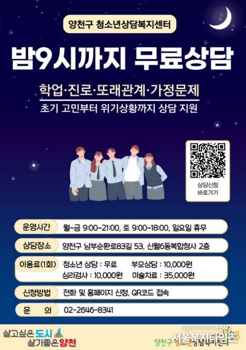 서울복지타임즈 이재연 기자 | 양천구가 심리적·정서적 어려움을 겪고 있는 청소년의 건강한 성장을 돕기 위해 마음건강 지원 강화에 나섰다. 올해부터 청소년상담복지센터 개인상담 서비스를 전면 무료화하고, 평일 밤 9시까지 연장 운영에 돌입한다.