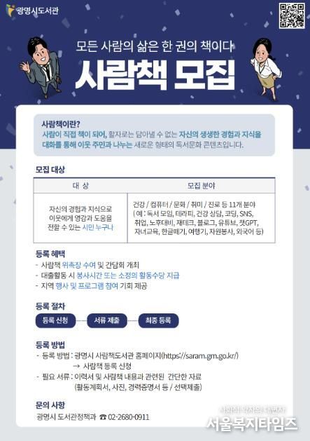 시는 책으로는 접하기 어려운 개인의 경험과 지혜를 이웃과 공유하는 ‘광명시 사람책’을 오는 2월 28일까지 모집한다고 16일 밝혔다. 올해는 시민이 직접 주변의 숨은 전문가를 추천하는 ‘사람책 이웃추천제’를 새롭게 도입한다.