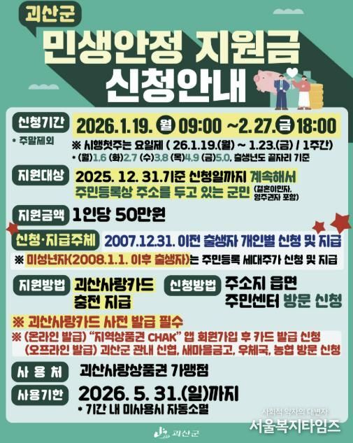 서울복지타임즈 이재연 기자 | 충북 괴산군은 지역경제 회복과 군민 생활 안정을 위해 추진하는 ‘괴산군 민생안정지원금’ 신청·접수를 오는 19일부터 2월 27일까지 실시한다고 밝혔다.
