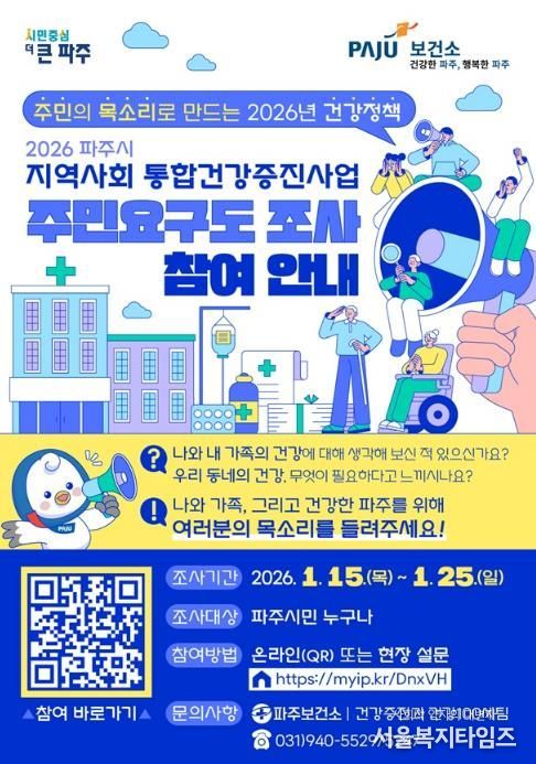 서울복지타임즈 이재연 기자 | 파주시는 시민의 건강한 삶을 지원하기 위해 '2026년 지역사회 통합건강증진사업’추진에 앞서 주민건강요구도 조사를 실시한다.