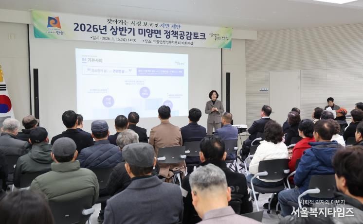 서울복지타임즈 이재연 기자 | 안성시 미양면은 지난 1월 15일, 미양면행정복지센터 대회의실에서 주민 120여 명이 참석한 가운데 ‘2026년 상반기 미양면 정책공감토크’를 성황리에 개최했다.