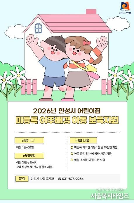 서울복지타임즈 이재연 기자 | 안성시는 2026년부터 어린이집에 다니는 미등록 외국인(이주배경) 영유아에게 월 10만원의 보육지원금을 지원한다고 밝혔다.