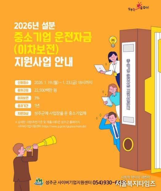 서울복지타임즈 이재연 기자 | 성주군은 설 명절을 앞두고 관내 중소기업의 자금 부담 완화를 위해 2026년도 중소기업 운전자금(이차보전) 설 명절분을 225억원 규모로 지원한다.