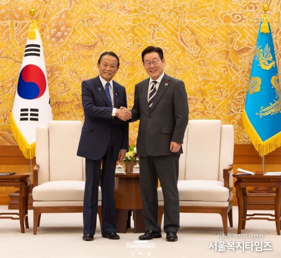 서울복지타임즈 이재연 기자 | 이재명 대통령은 16일 16시부터 약 30분간 '서울-도쿄 포럼' 참석차 방한한 아소 다로(麻生 太郎) 전 일본 총리를 접견하고, 이번 주 진행된 나라(奈良) 방문(1.13.-14.)과 한일 정상회담 결과 등에 대해 이야기를 나누었다.