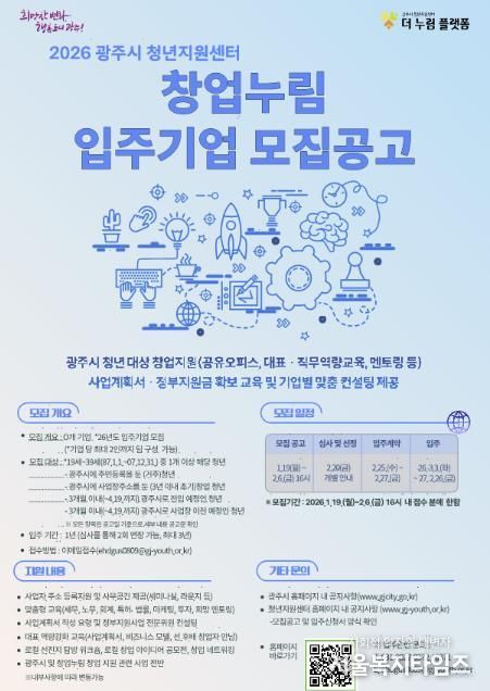 서울복지타임즈 이재연 기자 | 광주시는 지역 내 유망한 청년 창업가를 발굴하고 안정적인 창업 환경을 조성하기 위해 ‘2026년도 창업누림 신규 입주기업’을 공개 모집한다고 19일 밝혔다.