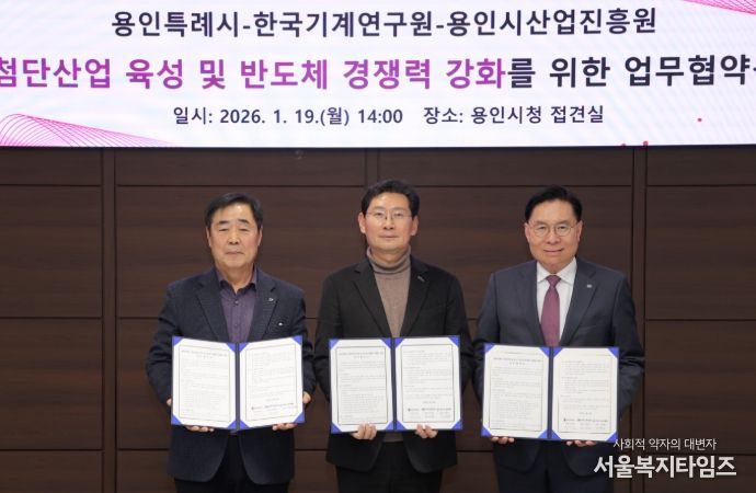 서울복지타임즈 이재연 기자 | 용인특례시는 19일 시청 접견실에서 한국기계연구원(KIMM), 용인시산업진흥원과 ‘첨단산업 육성 및 반도체 경쟁력 강화를 위한 업무협약’을 체결했다.