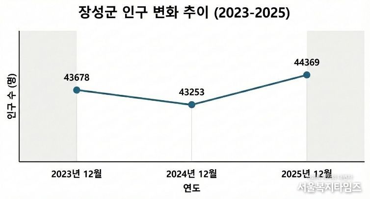 서울복지타임즈 이재연 기자 | 장성군이 지방 소멸과 인구 감소 우려를 해소하는 유의미한 통계를 발표했다. 군에 따르면 지난해 12월 집계된 장성군의 인구는 4만 4369명으로, 1년 전보다 1116명 증가한 것으로 나타났다.