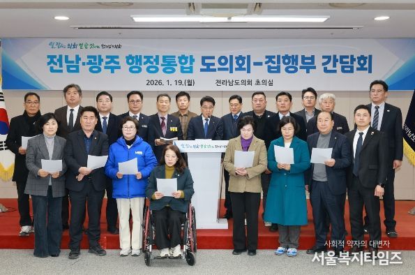 서울복지타임즈 이재연 기자 | 전라남도의회는 19일 도의회에서 김영록 전라남도지사와 김대중 전라남도교육감이 참여한 가운데 ‘전남·광주 행정통합 도의회–집행부 간담회’를 열고, 통합 추진 방향과 주요 쟁점에 대해 심도 있는 논의를 진행했다.