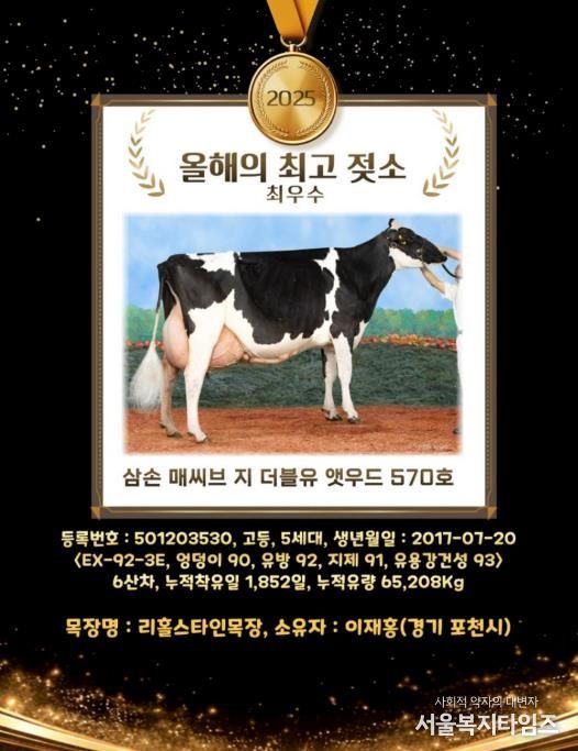 서울복지타임즈 이재연 기자 | 포천시는 관내 낙농농가인 리홀스타인목장(대표 이재홍)이 2025년 ‘올해의 최고 젖소’를 배출했다고 밝혔다.