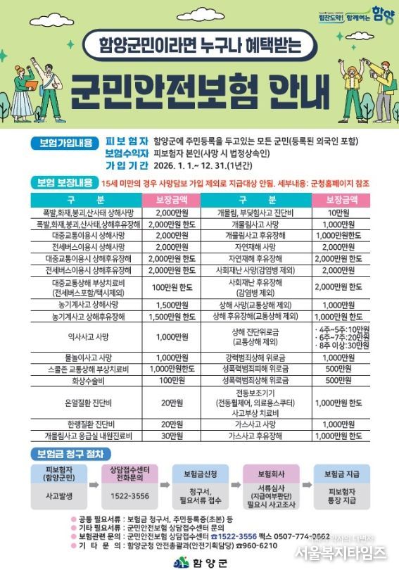 서울복지타임즈 이재연 기자 | 함양군은 군민들이 일상생활 속 각종 재난·사고로부터 보다 안전하게 보호받을 수 있도록 전 군민을 대상으로 한 ‘2026년 군민안전보험’에 가입해 운영한다고 밝혔다.