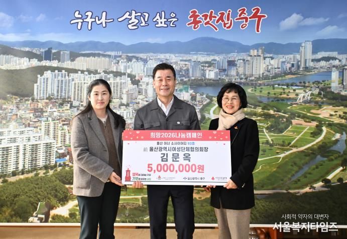 서울복지타임즈 이재연 기자 | 울산 제93호 아너소사이어티 회원인 김문옥 씨가 1월 21일 오전 10시 30분 중구청 구청장실을 찾아 울산사회복지공동모금회를 통해 이웃돕기 후원금 500만 원을 전달했다.