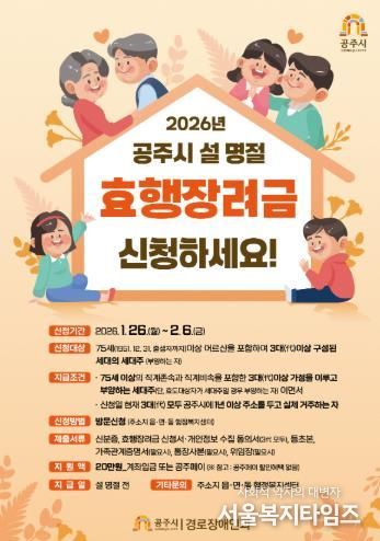 서울복지타임즈 이재연 기자 | 공주시는 지역사회 효 문화 확산과 효행 문화 발전을 위해 설 명절을 맞아 ‘효행장려금’을 지급한다고 22일 밝혔다.