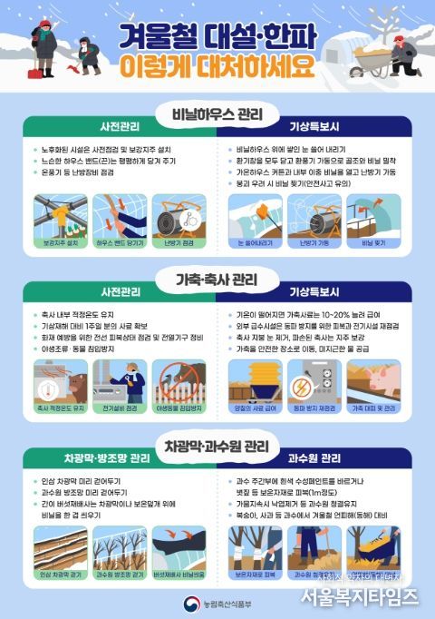 주요 대책으로 △한파 대비 가축과 축사시설 관리 요령 홍보 △겨울철 축산 재해 예방을 위한 현장점검 △축산 재해 대책 상황팀(T/F팀) 운영 등을 통해 겨울철 가축과 축산 시설물 피해를 사전에 방지한다는 계획이다.