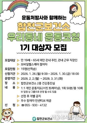 서울복지타임즈 이재연 기자 | 합천군은 개인별 체력과 건강 상태를 고려한 맞춤형 운동 프로그램 '우리 동네 운동코칭 : PT with U'에 참여할 1기 대상자를 모집한다고 23일 밝혔다.