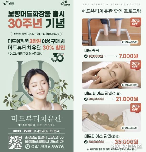 서울복지타임즈 이재연 기자 | 보령시는 보령머드화장품 출시 30주년을 맞아 오는 1월 30일부터 6월 30일까지 ‘머드뷰티치유관 30% 할인 이벤트’를 개최한다고 밝혔다.
