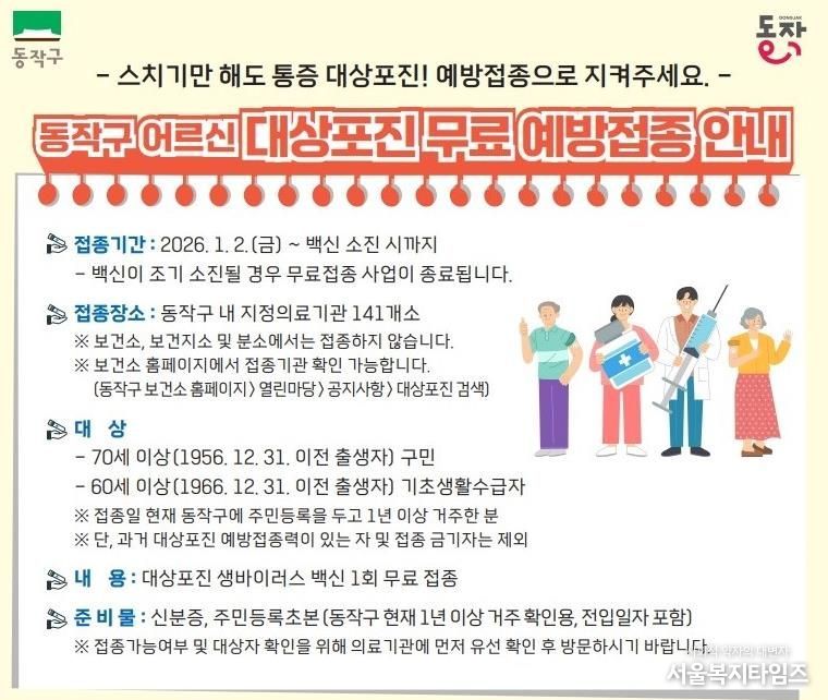 서울복지타임즈 이재연 기자 | 동작구는 감염성 질환에 취약한 어르신들의 면역강화와 건강 증진을 위해 ‘대상포진 무료 예방접종’을 실시한다고 밝혔다.