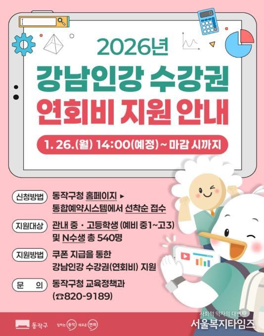 서울복지타임즈 이재연 기자 | 동작구가 관내 학생들의 교육비 부담 완화를 위해 ‘강남구청 인터넷 수능방송(이하 강남 인강) 수강료 지원사업’을 추진한다고 밝혔다.