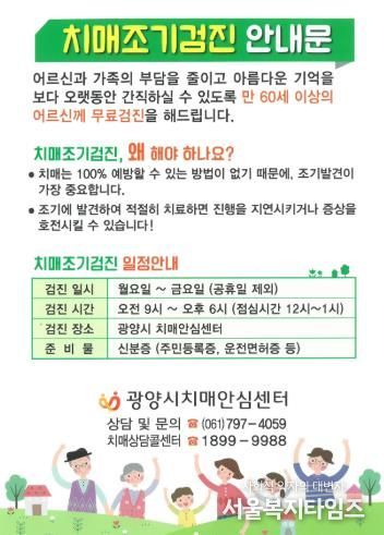 서울복지타임즈 이재연 기자 | 광양시치매안심센터는 치매를 조기에 발견하고 예방하기 위해 60세 이상 시민을 대상으로 치매 조기검진을 연중 실시하고 있다.