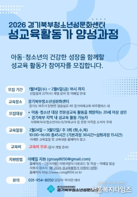 서울복지타임즈 이재연 기자 | 경기북부청소년성문화센터가 오는 2월 6일까지 청소년 성교육 활동가 양성과정에 참여할 지원자를 모집한다.
