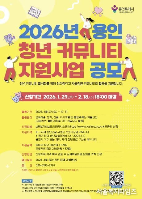 서울복지타임즈 이재연 기자 | 용인특례시는 2월 18일까지 ‘청년 커뮤니티 지원사업’에 참여할 10개 팀을 모집한다고 29일 밝혔다.