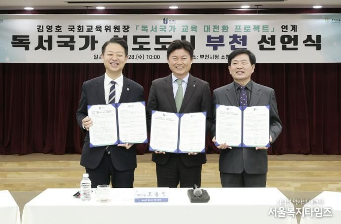 서울복지타임즈 이재연 기자 | 부천시는 지난 28일 부천시청 소통마당에서 국회 교육위원회, 부천교육지원청과 함께 ‘독서국가 선도도시 부천 업무협약’을 체결하고, 김영호 국회 교육위원장의 ‘독서국가 교육 대전환 정책’과 연계한 ‘독서국가 선도도시 부천 선언식’을 개최했다. 이날 행사에는 김 위원장을 비롯해 교육계·도서관 관계자, 시민 등이 참석했다.