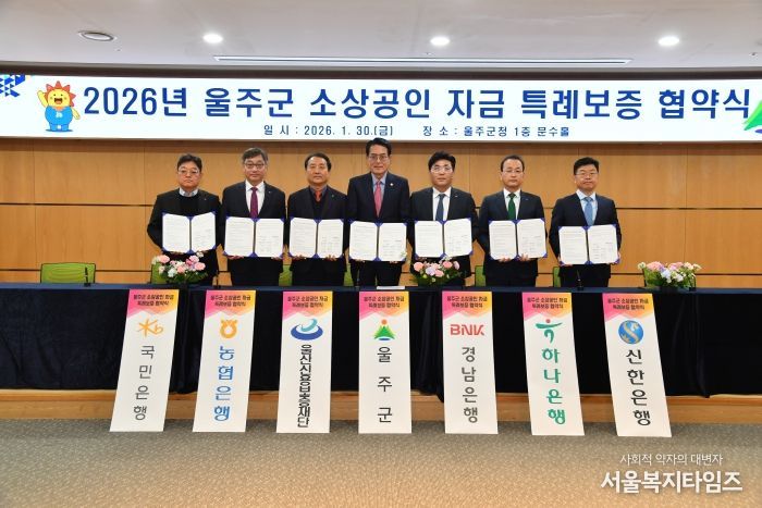 울주군은 이날 군청 문수홀에서 울산신용보증재단과 경남은행, 농협은행, 하나은행, 국민은행, 신한은행 등 5개 금융기관이 참여한 가운데 ‘2026년 소상공인 자금특례보증 지원 업무협약’을 체결했다.