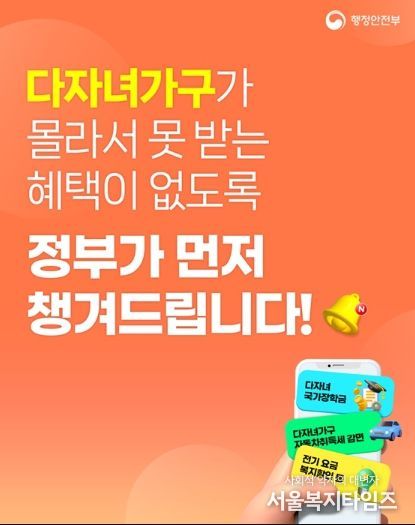 서울복지타임즈 이재연 기자 | ■ 다자녀가구가 몰라서 못 받는 혜택이 없도록 정부가 먼저 챙겨드립니다!