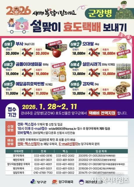 서울복지타임즈 이재연 기자 | 양구군이 관내 주둔 부대의 군 장병을 대상으로 설맞이 효도 택배 보내기 지원사업을 추진한다.
