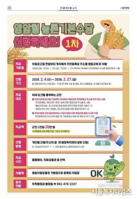 서울복지타임즈 이재연 기자 | 영암군이 이달 4~27일 군민의 지속가능한 삶을 지원하고 지역경제에 활력을 불어넣는 ‘영암형 농촌기본수당’을 지급한다.